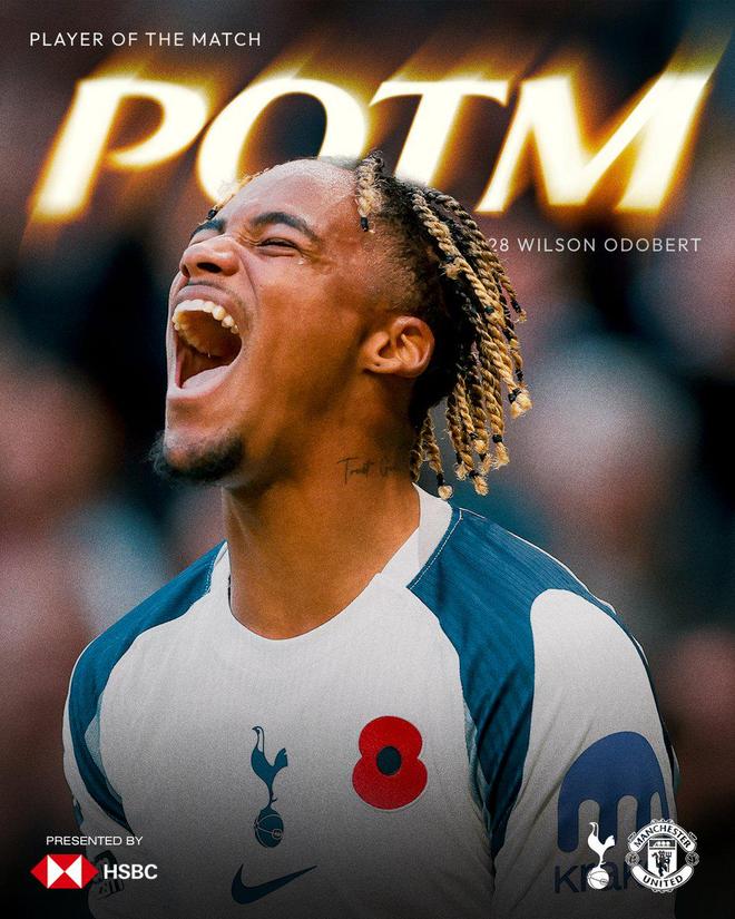 在周六晚进行的英超第11轮比赛中,热刺主场2-2战平曼联,赛后,奥多贝尔被评为热刺队内本场比赛的最佳球员。
