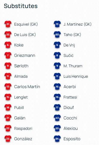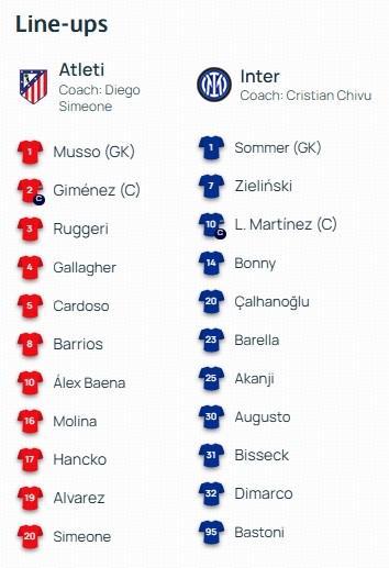 马竞首发:1-穆索、16-莫利纳、2-希门尼斯、3-鲁杰里、17-汉茨科、4-加拉格尔、5-卡多佐、8-巴里奥斯、10-巴埃纳、20-朱利亚诺-西蒙尼、19-阿尔瓦雷斯