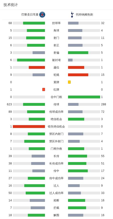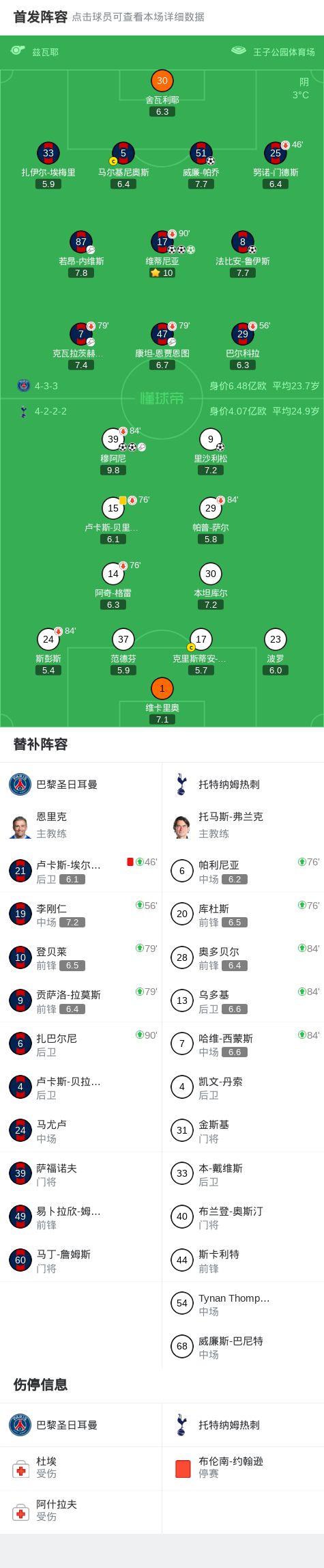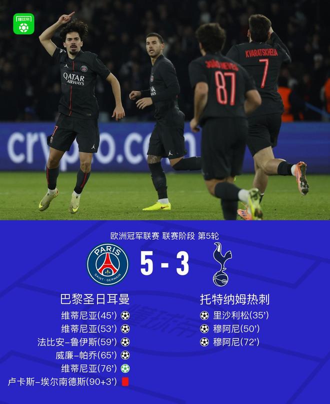 北京时间11月27日欧洲冠军联赛 联赛阶段 第5轮,巴黎圣日耳曼对阵托特纳姆热刺。上半场穆阿尼率先助攻里沙利松头球破门打破场上僵局,随后维蒂尼亚弧顶前迎球抽射将比分扳平。下半场穆阿尼禁区抽射破门弑旧主,维蒂尼亚调整左脚兜射破门还以颜色,若昂-内维斯送出助攻,法比安-鲁伊斯破门将比分逆转,威廉-帕乔在小禁区抢射破门扩大优势,随后维蒂尼亚出球失误,穆阿尼突破劲射梅开二度。比赛尾声阶段罗梅罗手球送点,维蒂尼亚点射破门完成帽子戏法。补时阶段卢卡斯-埃尔南德斯肘击动作,裁判经VAR后出示直红。全场战罢,最终比分巴黎圣日耳曼 5-3 热刺。